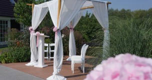 Handig verhuur is gespecialiseerd in het verhuren van trouwartikelen en bruiloftsspullen waaronder meubilair voor tijdens de ceremonie. Hieronder valt ook het trouwprieel gemaakt van bamboe, die te decoreren is naar het thema van uw bruiloft of trouwerij.