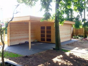 Het voordeel van een dergelijke blokhut met luifel met plat dak is dat u zowel bergruimte als een overdekt terras heeft. Een plat dak is goedkoper dan een punt dak. Tevens is een tuinhuis met overkapping met plat dak doorgaans vergunningsvrij . Met de keuze uit diverse afmetingen, houtdiktes, ramen en deuren stelt u zelf uw eigen blokhut met plat dak samen. De blokhut of tuinhuis maken wij in onze eigen blokhutten fabriek in Emmen. Het platte dak geeft een modern uiterlijk aan uw tuin.