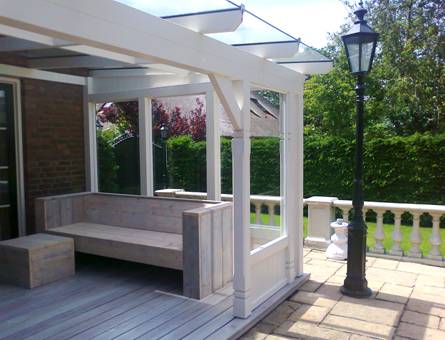 Om heel het jaar van uw terrasoverkapping te kunnen genieten zijn er verschillende uitbreidingsmogelijkheden, zoals vaste glaswanden. Ons pakket glaswanden bestaan uit, schuine spieën tbv uw terrasoverkapping , vaste kozijnen in de voor- en zijkant van uw overkapping en schuifwanden.