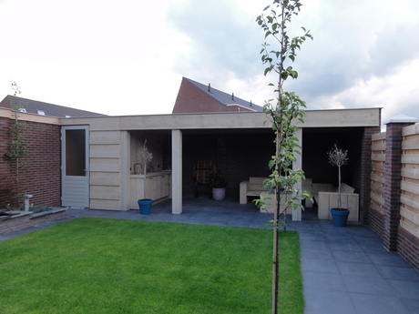 In krap een paar maanden tijd werd het plan voor nieuwbouw van een garage en een veranda uitgevoerd. Wij hebben voor deze nieuwbouw opdracht in Aalsmeer gewerkt met robuuste en moderne materialen. Voor een particuliere opdrachtgever uit Alblasserdam is een ruime buitenlounge ontworpen, gekoppeld aan een bestaande garage die verbouwd wordt. De lounge bevat een zithoek aan een ruw gemetselde open haar die doorzicht geeft op de ruime eethoek.